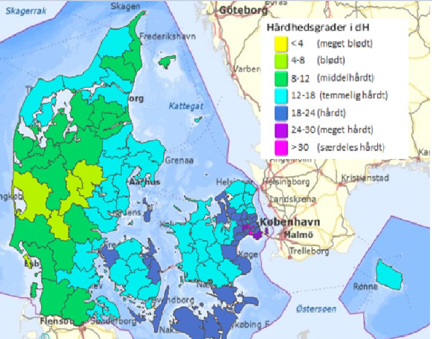 Vandet er blødt i Vestjylland og hårdt i Københavnsområdet. Bornholm befinder sig, overordnet set, i en midtergruppe: Temmelig hårdt.
